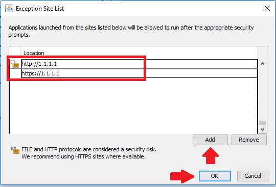 - Click Add and type HTTP followed by the IP or hostname you are connecting to. Do the same for HTTPS