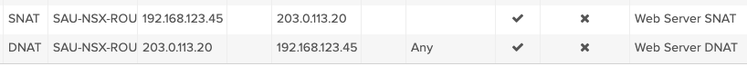 Continuing from the NAT network above, we want to translate Public IP 203.0.113.20 to Private IP 192.168.123.45. This can be done in the NAT tab of the NSX.